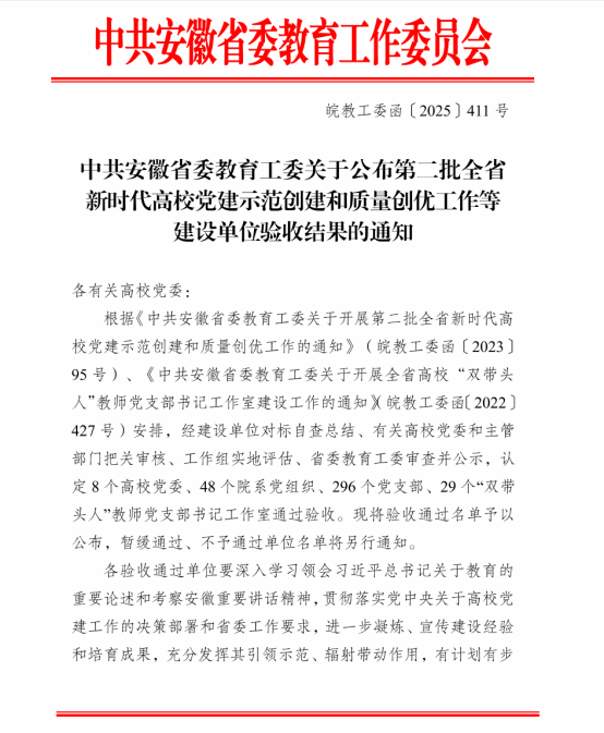 近日,中共安徽省委教育工委公布第二批新时代高校党建示范创建和质量创优工作验收结果,电子...【详细信息】