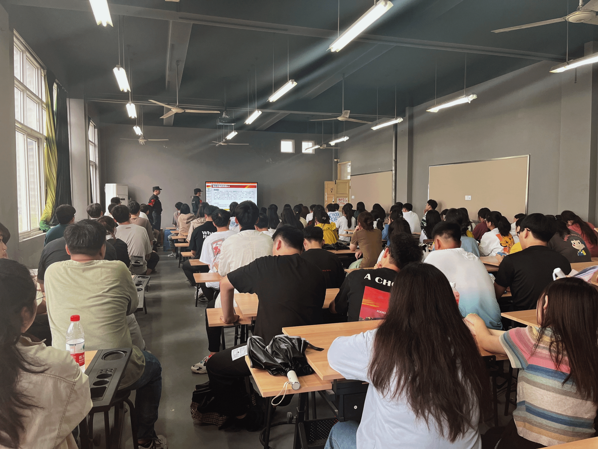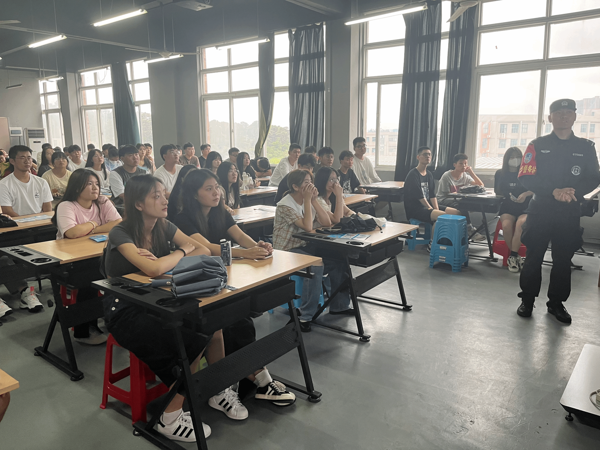 为有效开展新生入学教育,营造知法、懂法、守法的良好风气,促进平安校园建设,9月14日下午,我系特邀马鞍山市特警支队民警,为2022级全体新生分场次开展法制宣教活动,四百七十余名高职新同学接受宣讲教育。