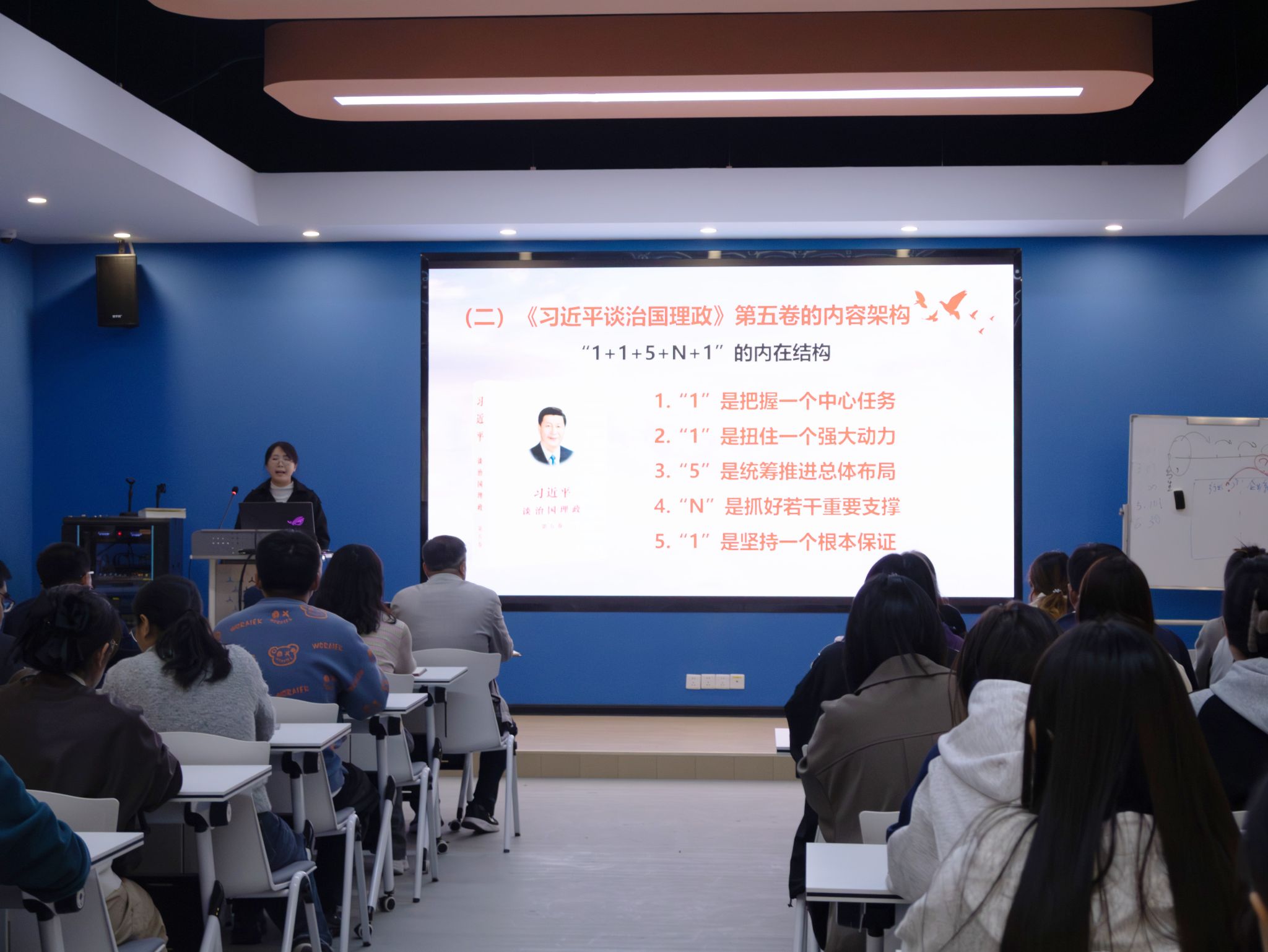 报告会上,毛晓慧老师围绕“进一步全面深化改革”这一核心主题,从整体架构、主题内容与学习方法三个维度,系统解读了《习近平谈治国理政》第五卷中关于进一步全面深化改革的重要论述。她结合理论与实践,深入阐释了全面深化改革的历史背景与战略意义,系统梳理了党的十八大以来深化改革取得的重大成就,深刻阐述了在新起点上“进一步全面深化改革”的时代必要性与战略方向,并指明了推进改革的实践路径与关键举措。此外,她还分享了研读《习近平谈治国理政》第五卷的方法与心得体会,引导师生把握理论精髓、领会思想脉络。