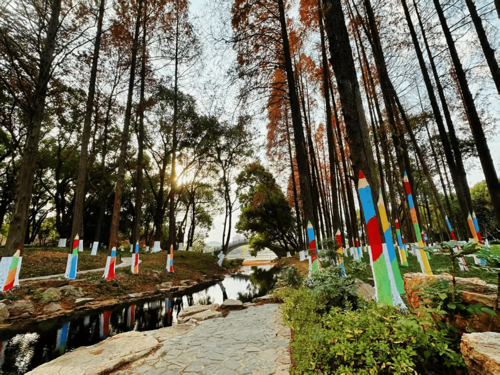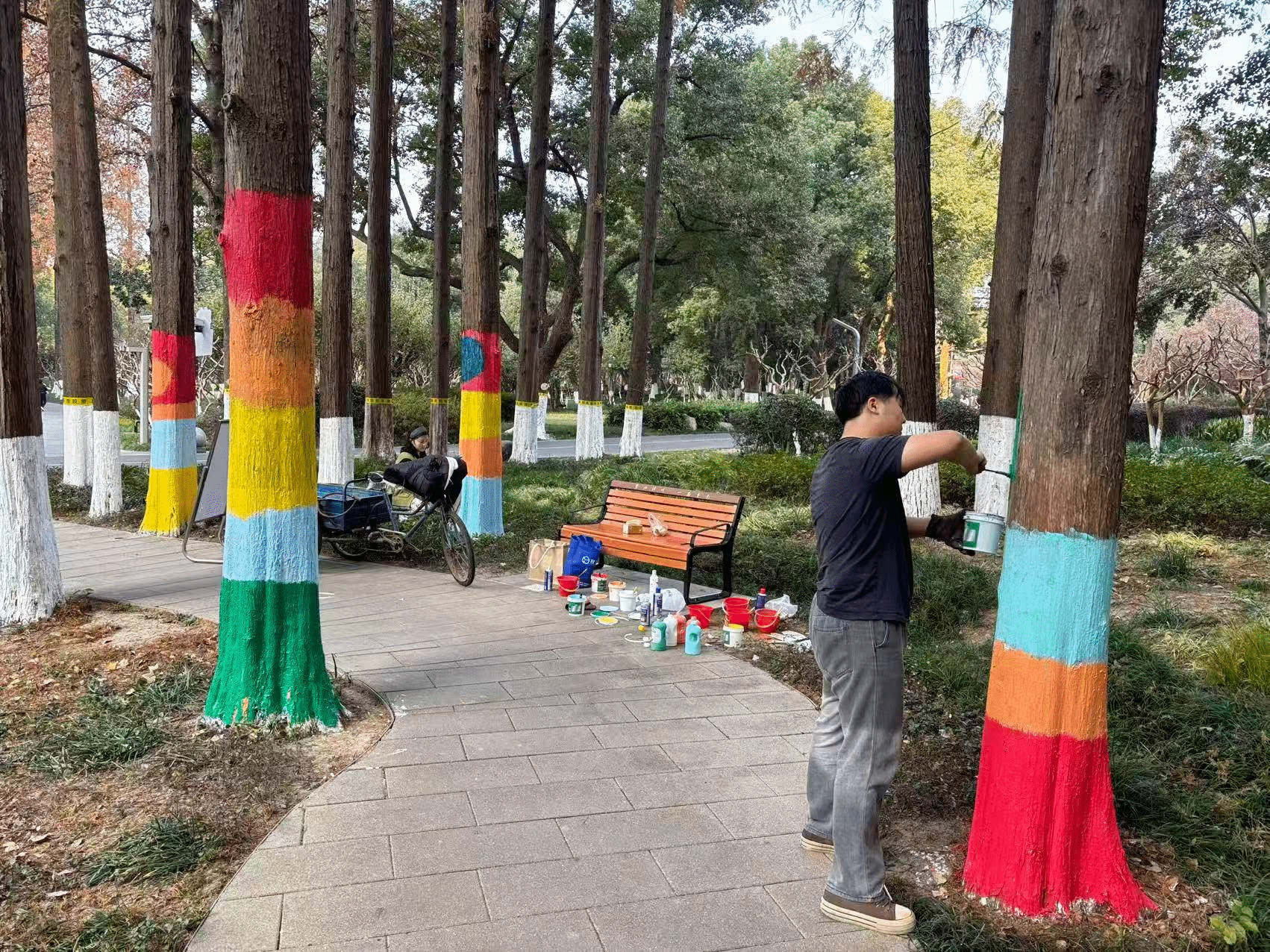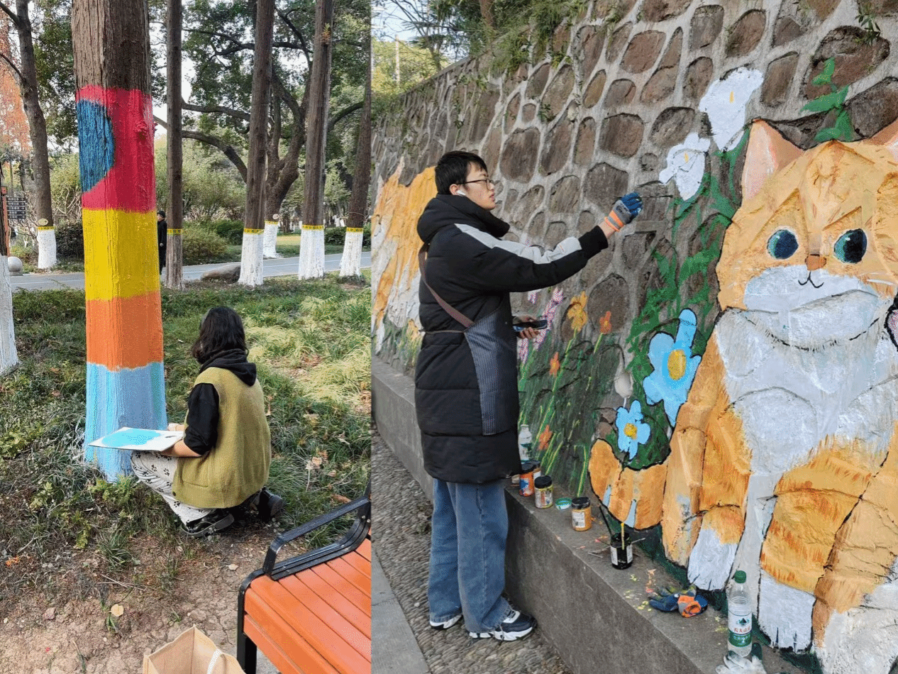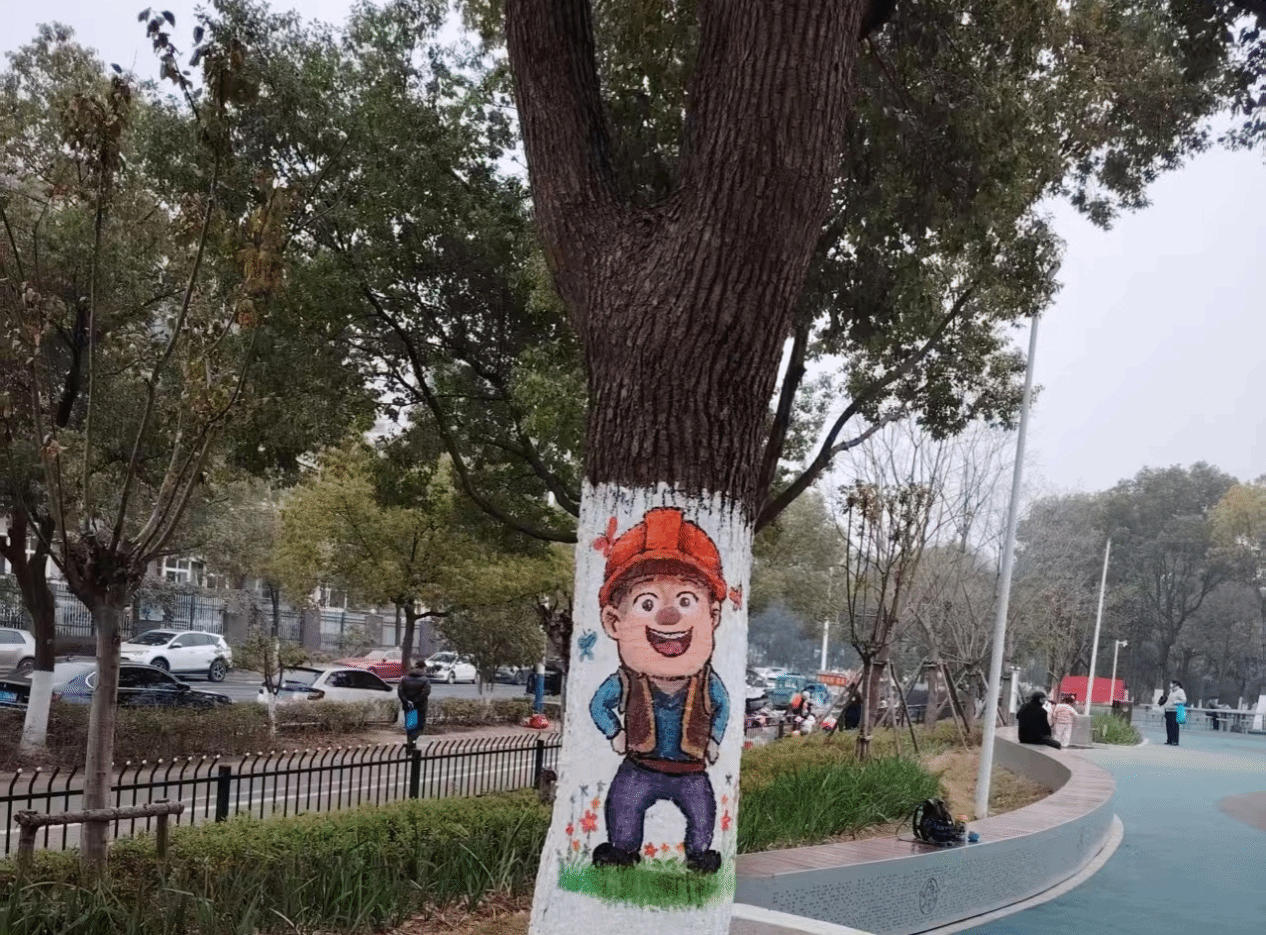 在雨山湖公园,原本朴素的树干经过师生们的精心绘制,焕发出全新的艺术生命力。树懒“闪电”的慢萌神态、豹警官的可爱瞬间、充满奇思的“铅笔森林”项目引人注目,不仅让树木本身成为了故事载体,更将公园步道变成了充满惊喜的“童话走廊”。类似的创意也在东湖公园游乐场的“熊出没”主题区、佳山公园的“小懒猫”墙绘项目中精彩呈现。市民们纷纷感叹“走在公园里像闯进了童话世界”,这些作品以其独特的艺术感染力赢得了广泛赞誉。