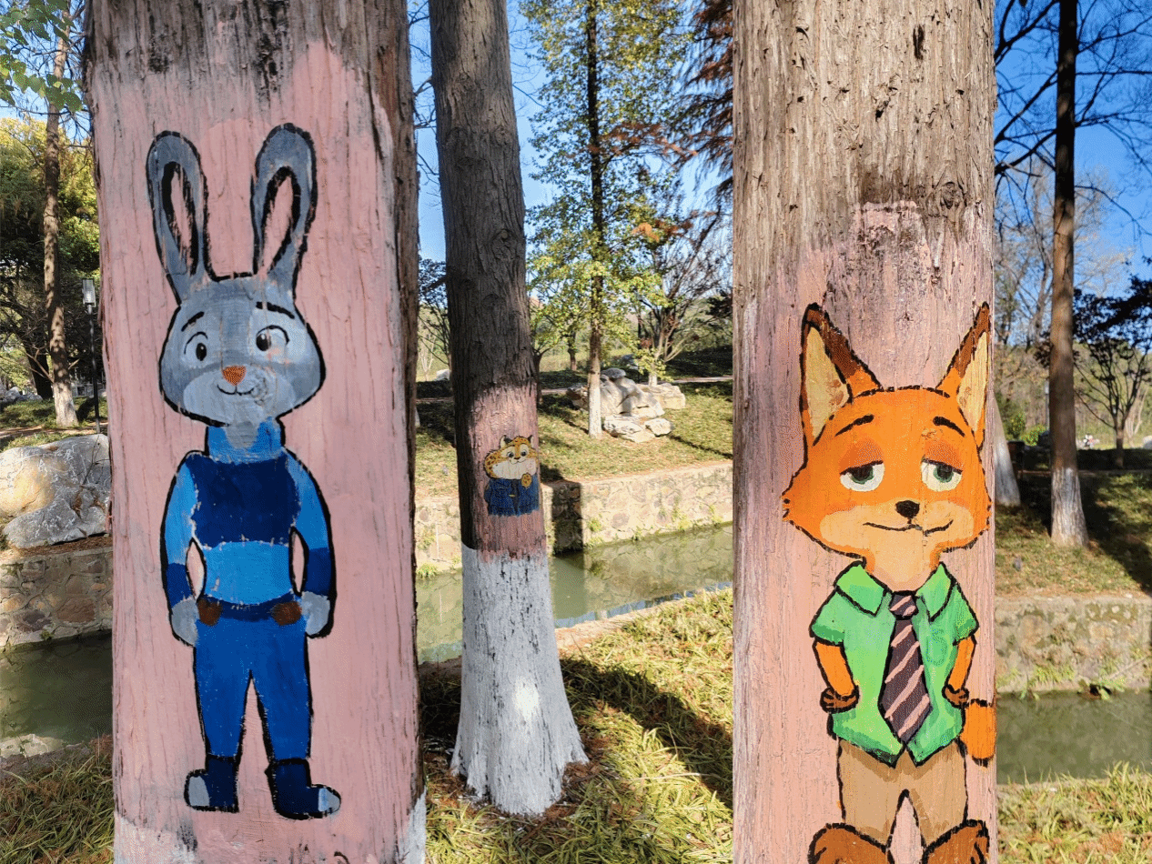 近日,马鞍山雨山湖公园、佳山公园、东湖公园游乐场内,一系列萌趣盎然的树干、墙体彩绘悄然出现,成为了市民游客驻足打卡的“网红”新景。这些将《疯狂动物城》角色、“熊出没”家族等卡通形象与树木自然形态、墙体特征巧妙融合的创意作品,均出自马鞍山职业技术学院电子信息系数字艺术专业群师生之手。此次系列创作活动,是我系深化产教融合、推动专业服务社会的又一次生动实践与成果集中展示。