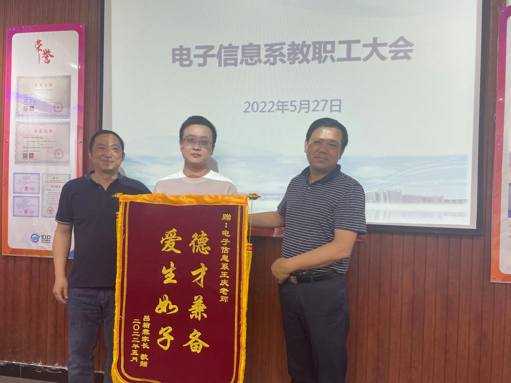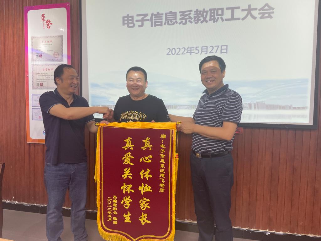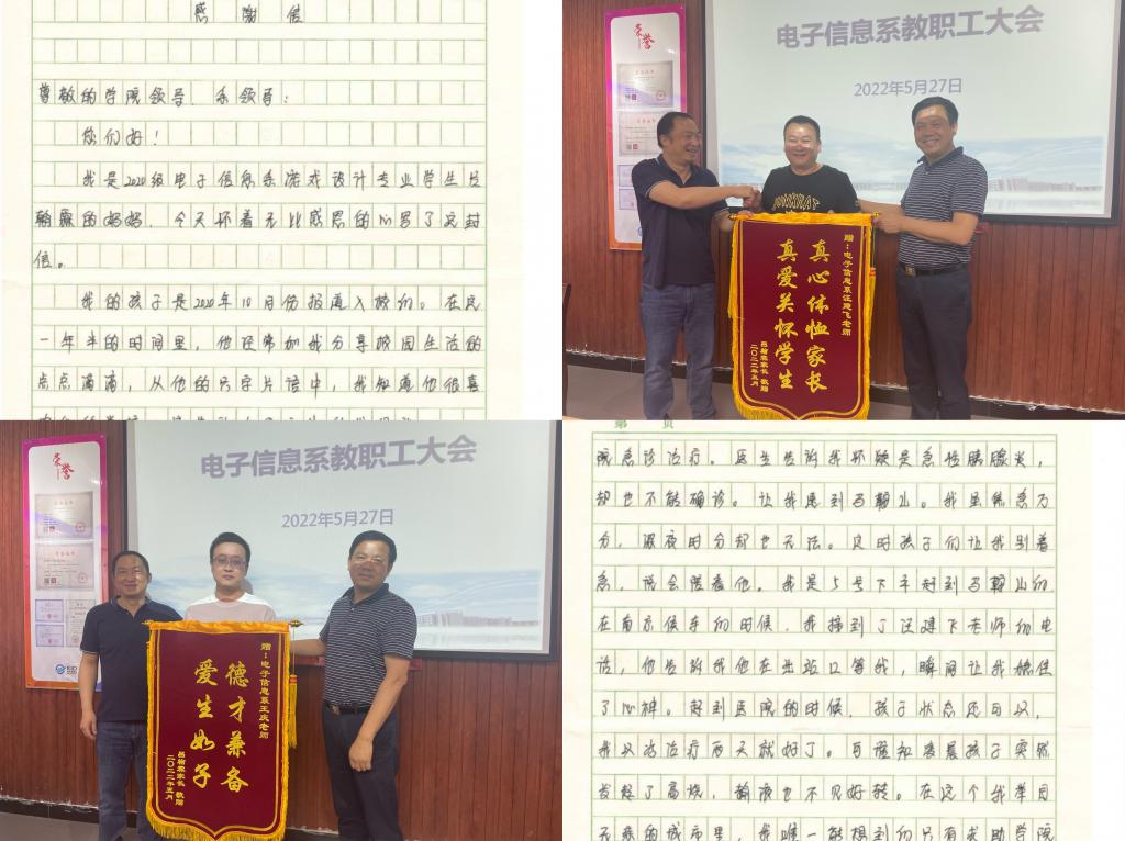 近日,我系收到一份特殊的礼物——两面绣有“真心体恤家长,真爱关怀学生”“德才兼备,爱生如子”的锦旗和一封手写感谢信。这是2020级游戏设计专业学生吕翰霖妈妈从千里之外的石家庄邮寄过来的,用以表达对我系汪建飞、王庆两位辅导员和系领导的感激之情。5月27日下午在北区培训楼会议室,系党总支书记胡柱萍、系主任占德胜、系副书记、副主任王为钢在全系教师的见证下,为两位辅导员转赠了锦旗。