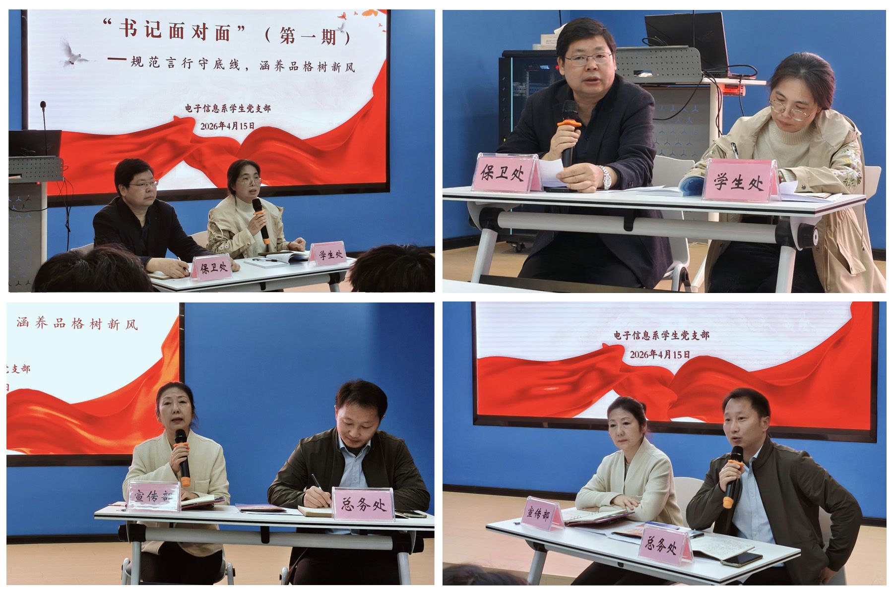 4月15日下午,电子信息系学生党支部在学院“一站式”学生社区开展党建特色活动——“书记面对面”。这是我系首次开展“书记面对面”主题教育活动,活动以“规范言行守底线,涵养品格树新风”为主题,旨在搭建师生沟通桥梁,强化学生行为规范教育,提升校园文明素养。学生处赵玲处长、宣传部笪鸿雁副部长、保卫处张军副处长和总务处代忠红副处长应邀参加了本次活动,系党总支、教工党支部、学生党支部相关同志,以及各班级学生代表共同参加活动。